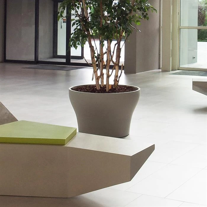 Polymer Concrete is a moulded stone composite, which is ideal for use in public spaces. The material is highly compressed, making it extremely strong. Natural minerals mixed with binding agents, that are becoming increasingly recyclable. The planters are not submitted to wear and tear. They are 100% watertight and are therefore extremely frost resistant. The closed structure of the material means that it does not hold dirt and will naturally clean from rain water.Â
