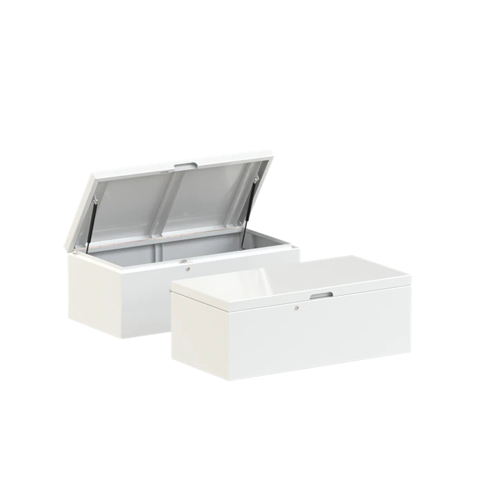 The garden box is made of strong, low-maintenance aluminium. Once constructed, the box is powder coated with a strong adhesive primer. It is then finished with a scratch-resistant colour coating. The box is easy to open and close thanks to the solid lid construction and gas-spring hinges. An integrated lock ensures that cushions and other items can always be stored securely.