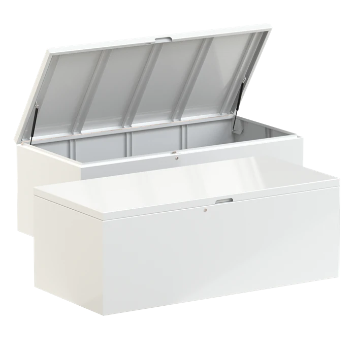 The garden box is made of strong, low-maintenance aluminium. Once constructed, the box is powder coated with a strong adhesive primer. It is then finished with a scratch-resistant colour coating. The box is easy to open and close thanks to the solid lid construction and gas-spring hinges. An integrated lock ensures that cushions and other items can always be stored securely.